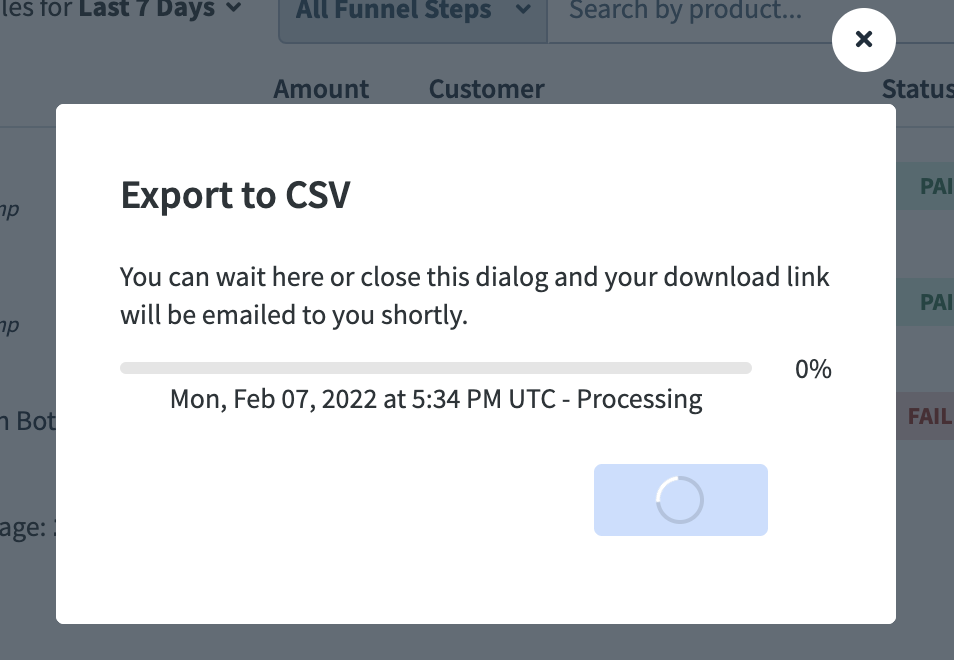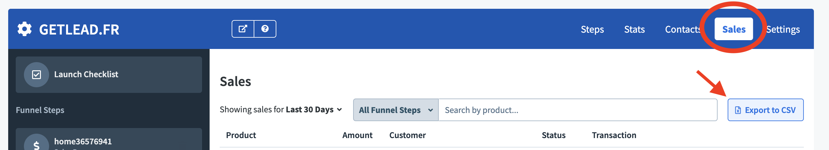 Lorsque vous êtes dans votre Funnel, rendez-vous dans l'onglet "sales" puis "export to CSV"