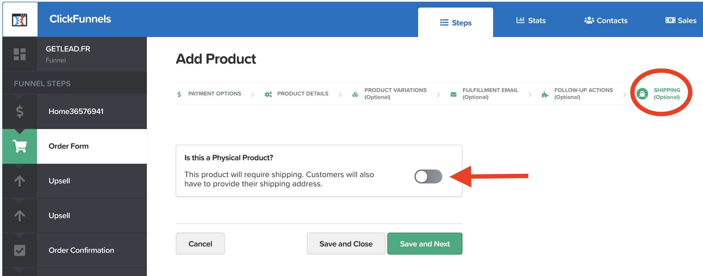 Veillez à bien avoir séléctionner une étape de type "order form" afin de pouvoir créer un produit. Lorsque vous cliquez sur "Edit" sur le produit en questions, rendez-vous dans "shipping" puis cocher la case "is this physical product". Puis, sélectionnez votre compte Shopify à synchroniser.