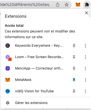 Vous devrez maintenant l'ouvrir. Si vous avez plusieurs extensions sur votre navigateur, vous aurez en haut à droite (à côté de la barre de recherche) une pièce de puzzle et en cliquant dessus, un menu déroulant s'affichera avec toutes vos extensions. Si vous n'avez qu'une extension, vous aurez un petit K toujours à côté de la barre de recherche.