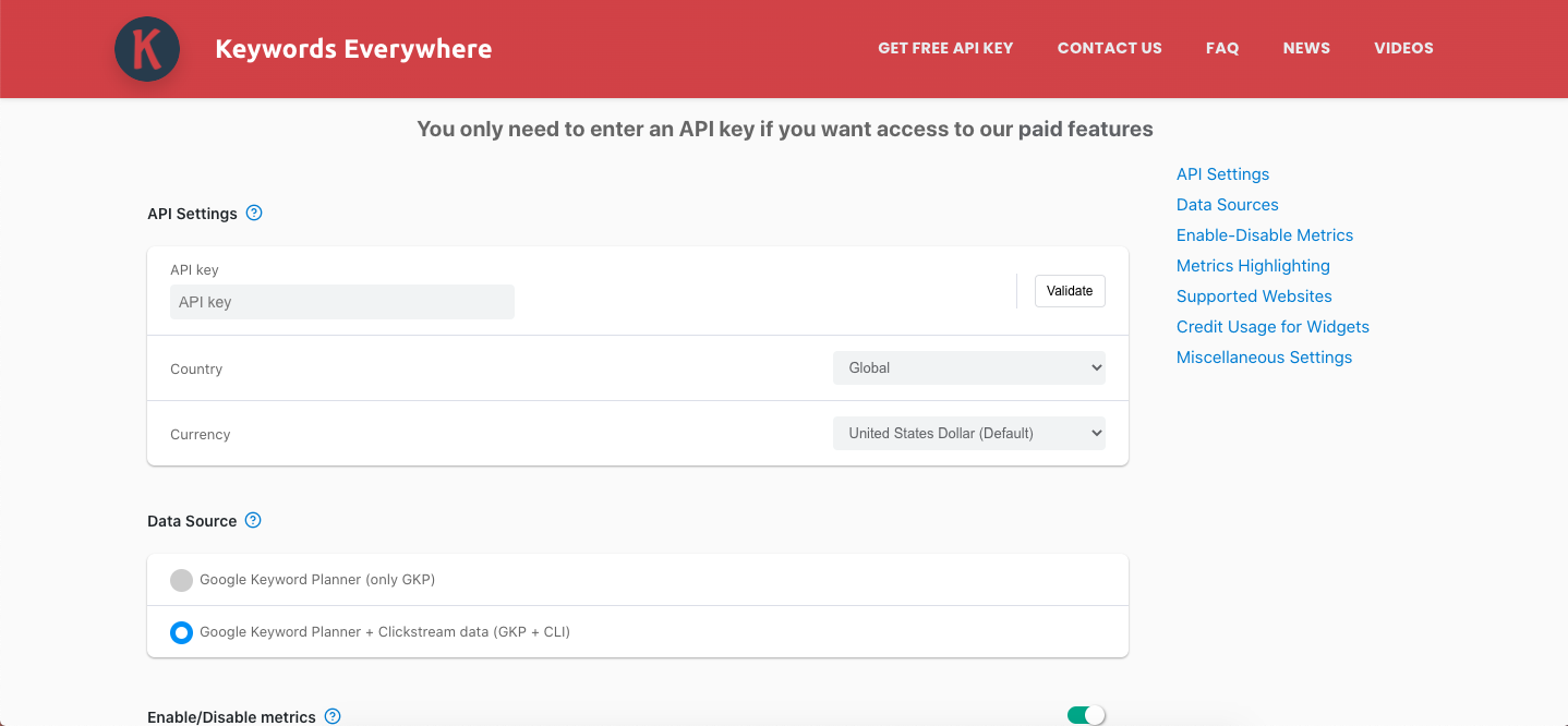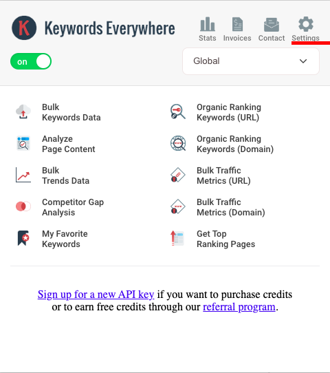 L'utilisation de la plateforme est payante. Pour faire simple, une recherche de mot-clé représente 1 crédit dépensé. C'est-à-dire que 10$ représentent 100 000 recherches ce qui est largement suffisant pour faire vos recherches. (Il est possible de voir votre nombre de crédit dans les options).