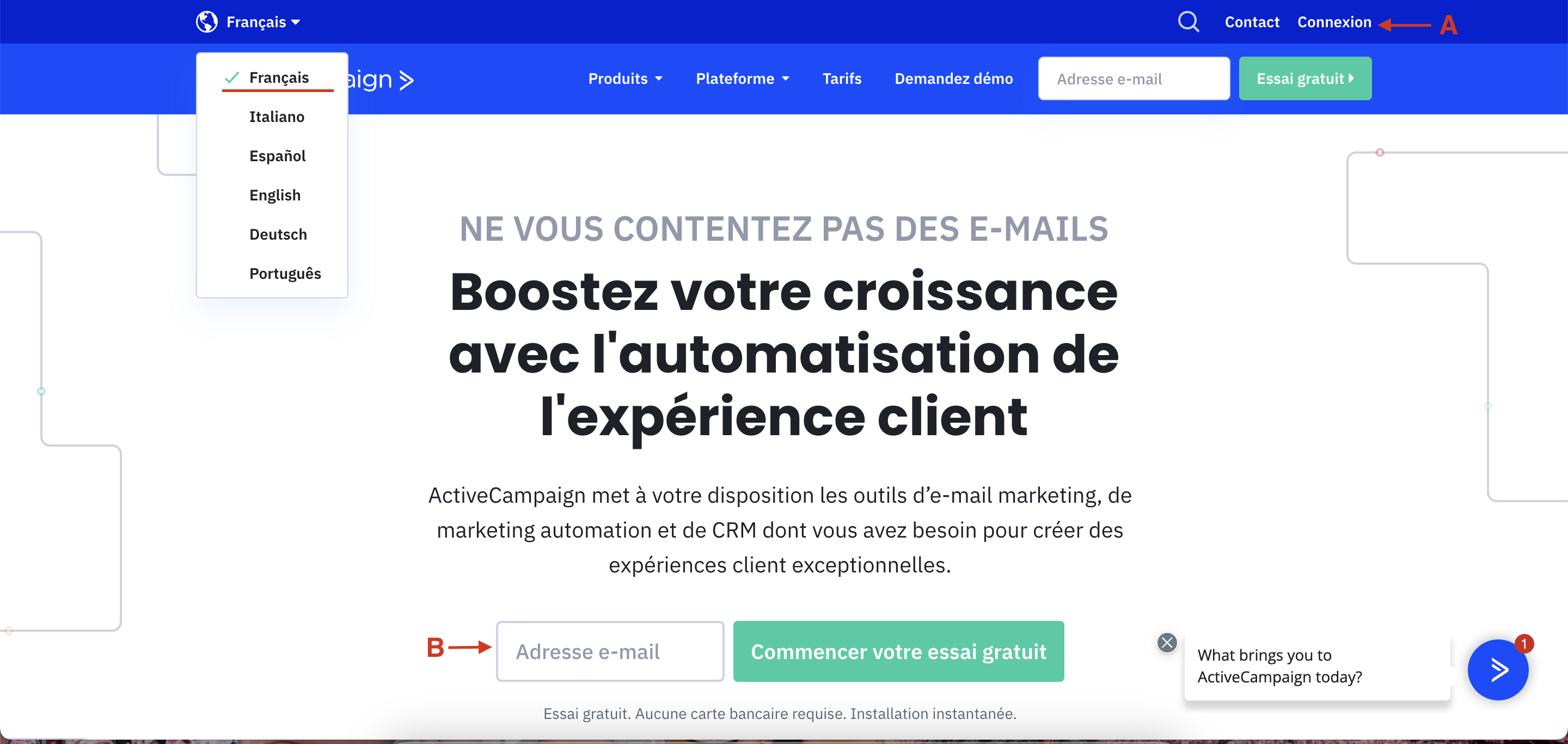 1. Rendez-vous sur la page d'accueil d'Active Campaign via ce lien : https://www.activecampaign.com/ pour vous créer un compte. Vous avez la possibilité de choisir la langue en haut à gauche. Vous pouvez cliquer sur connexion en haut à droite (A) ou entrer votre adresse e-mail au milieu de la page (B) puis sur commencer votre essai gratuit.