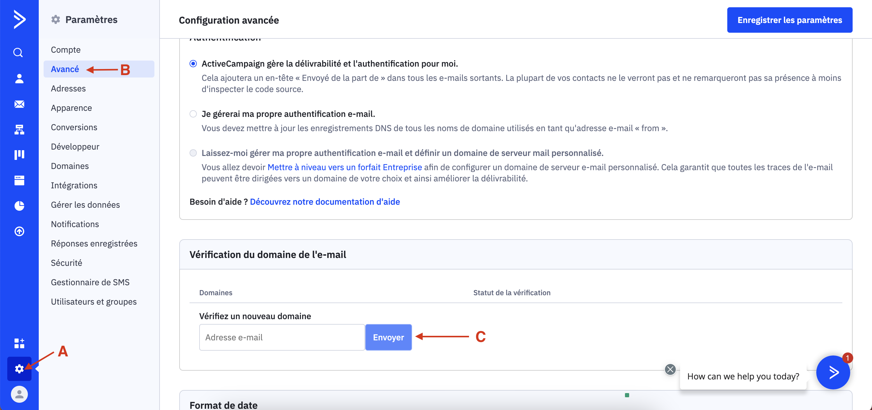 Cliquez sur "paramètre" (A) dans le menu à gauche, sur "avancé" (B) et entrez votre adresse mail dans la partie "Vérification du domaine de l'e-mail" (C). Vous pourrez valider dans votre boîte mail. Si vous ne l'avez pas reçu, vous pourrez cliquer "Renvoyer l'e-mail de vérification".