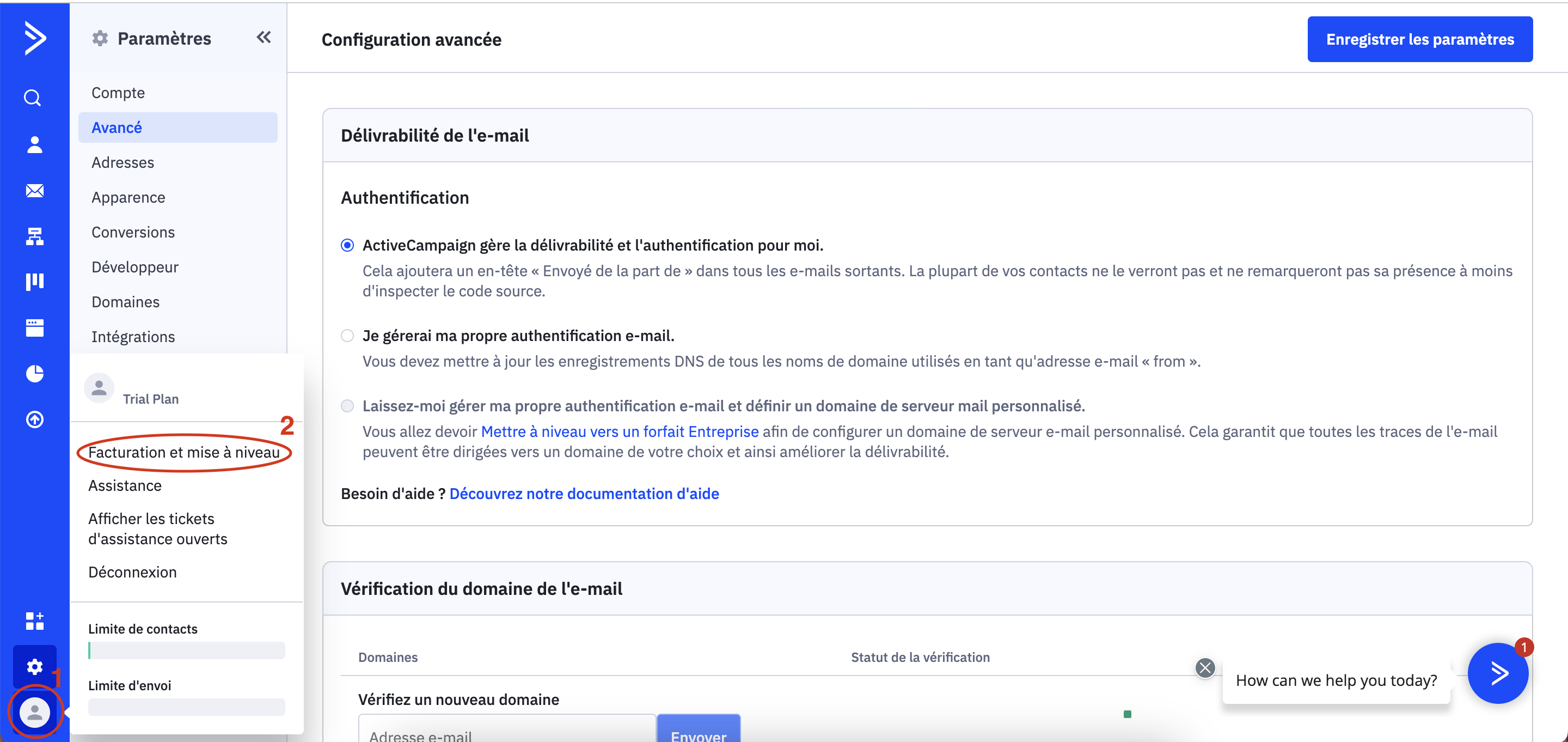 4. Active Campaign propose une période d'essai. Vous pourrez accéder aux différents plans d'abonnement en cliquant sur le dernier logo (1) en bas à gauche et sur "facturation et mise à niveau" (2) pour mettre à jour vos informations de paiement à l'issu de cette période.