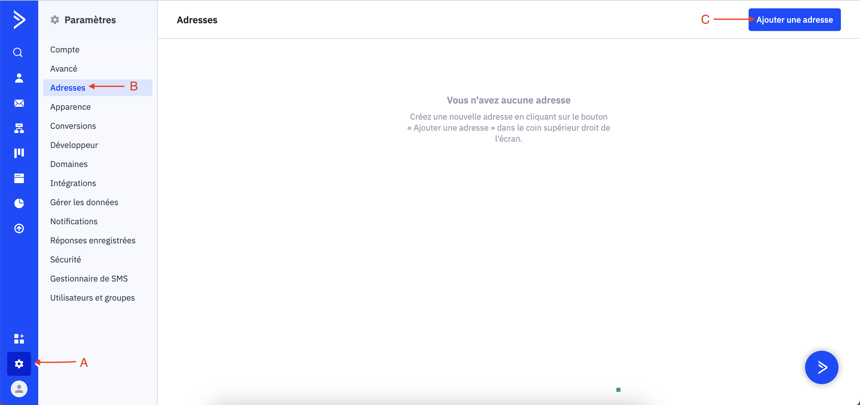 5. Vous devrez maintenant entrer votre adresse postale. Cette étape est obligatoire car c'est la loi en tant que professionnel. Cliquez donc sur paramètre (A), sur adresses (B) puis sur ajouter une adresse en haut à droite (C). Vous pourrez ici compléter le formulaire.