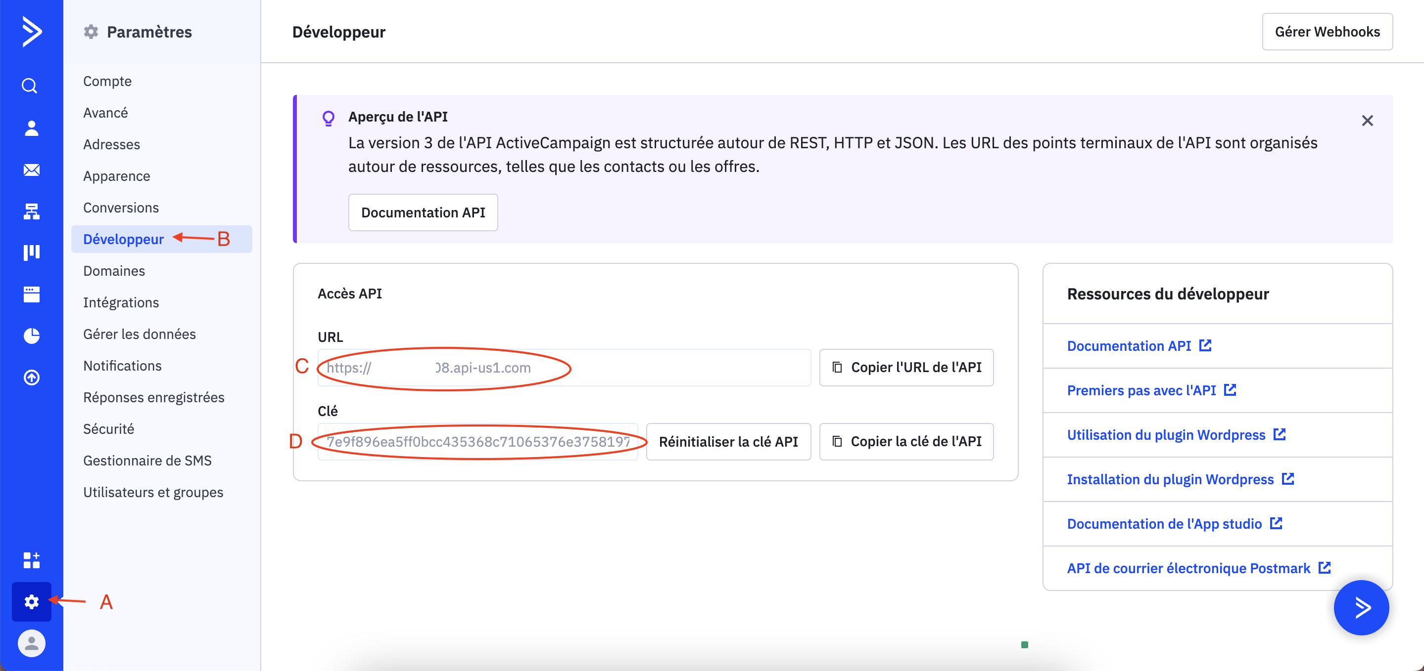 1. Allez dans les paramètres (A), cliquez sur développeur (B) pour trouver un URL (C) et une clé (D).