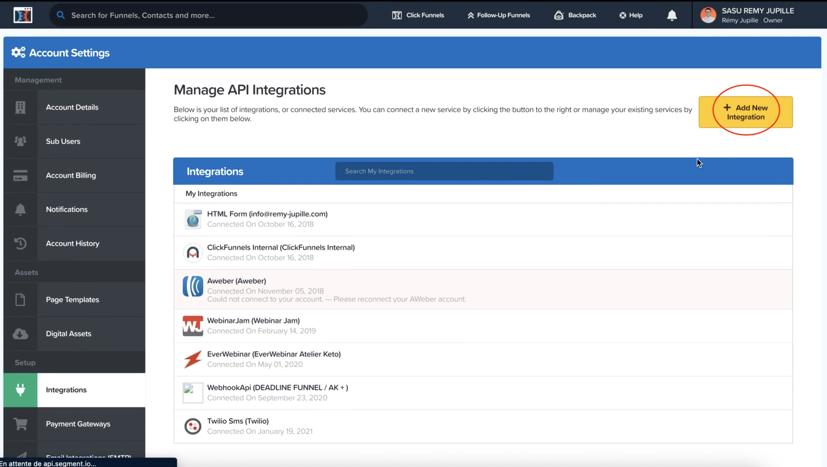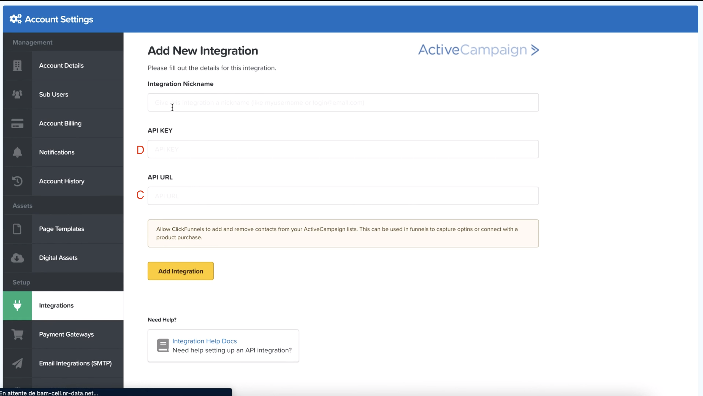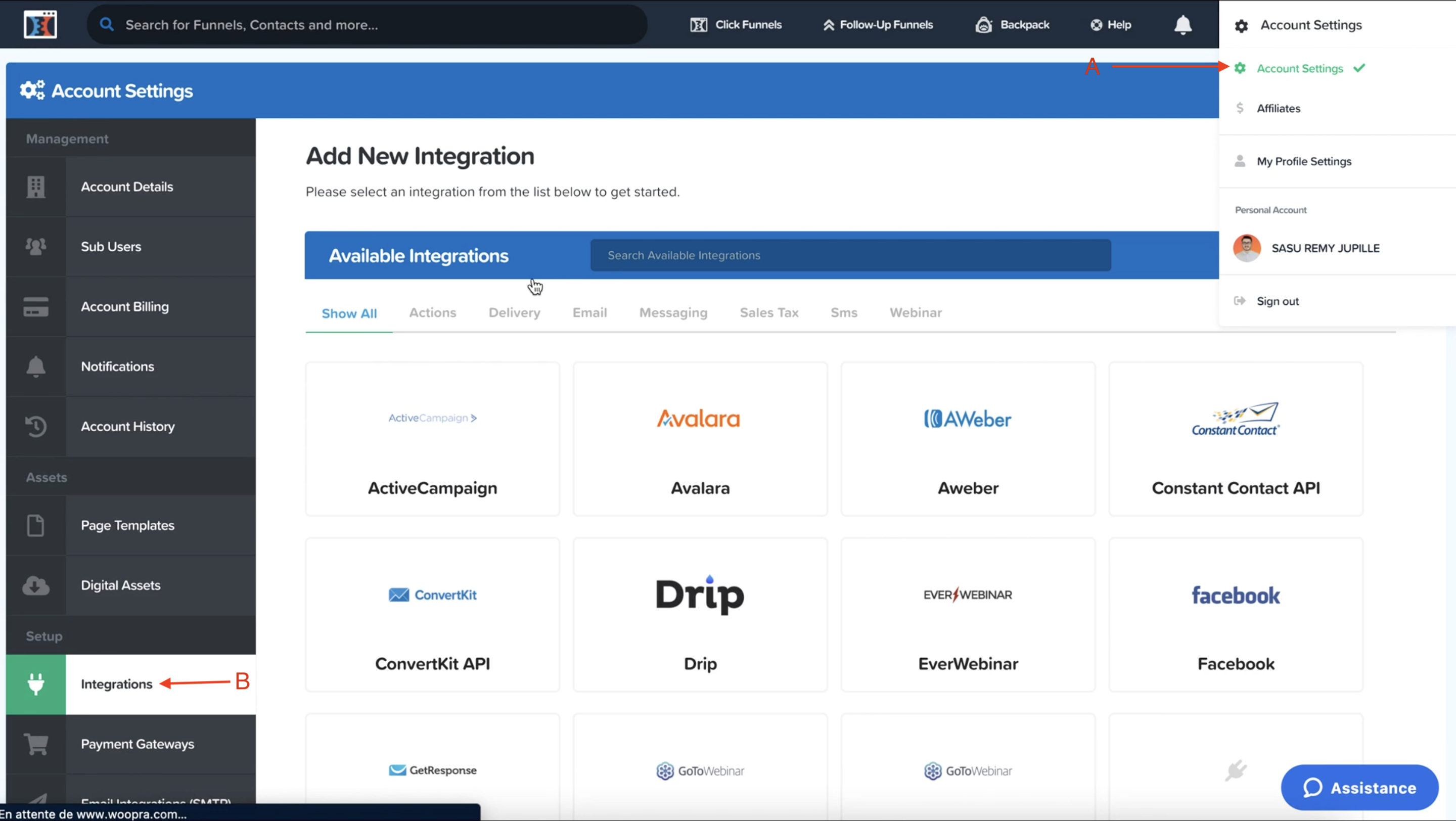 2. Ouvrez Clickfunnels s'il n'est pas ouvert dans un nouvel onglet, cliquez en haut à droite puis sur account settings (A) et dans integration (B). Ici, cliquez sur "add new integration" et cliquez sur ActiveCampaign dans la liste ci-dessous (vous pouvez également le rechercher si besoin).