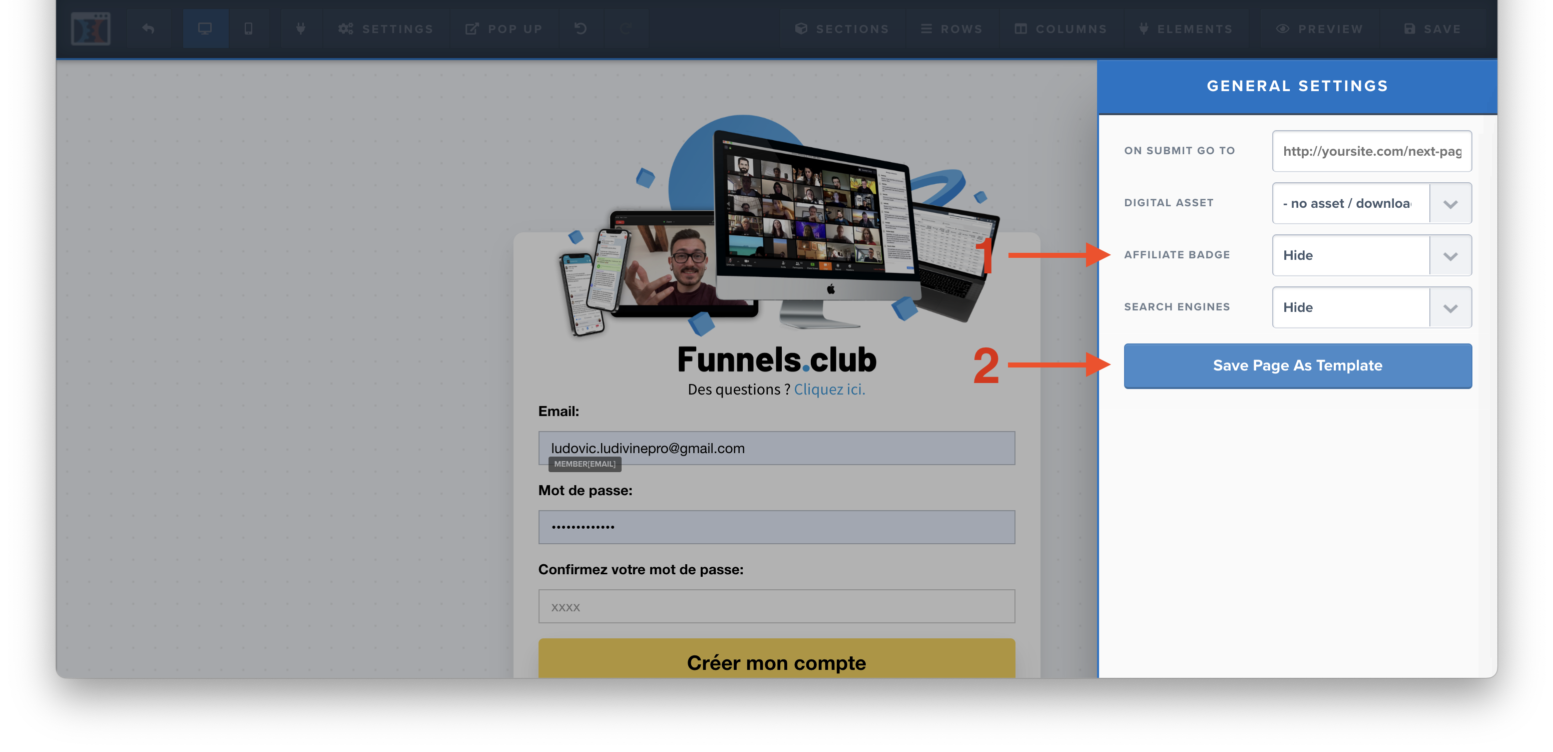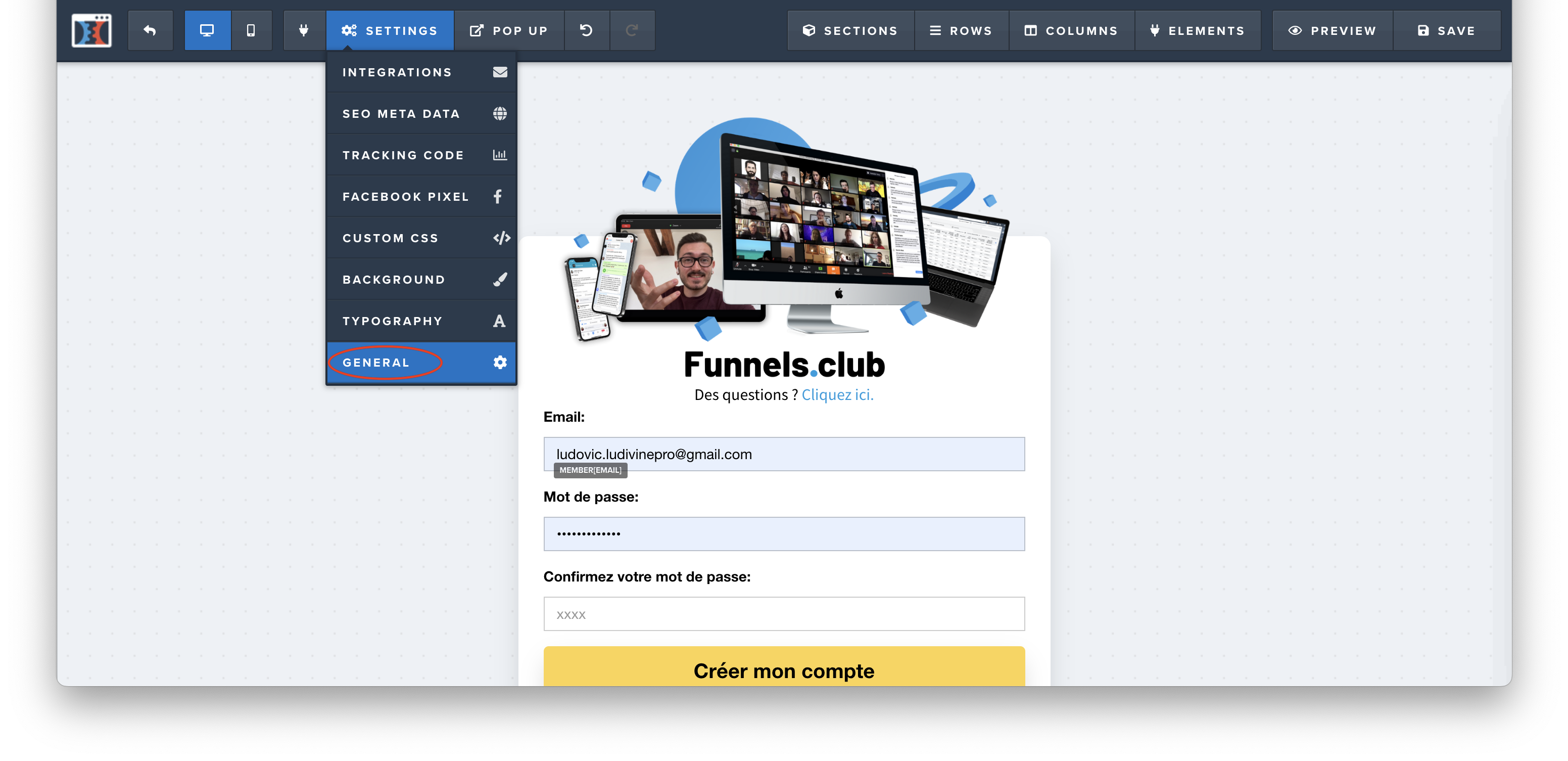 1. Vous devez aller dans l'éditeur de votre page de tunnel et cliquer sur setting en haut à gauche puis general.