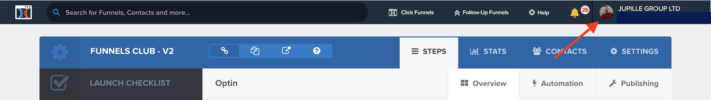 1. Sur la page d'accueil de ClickFunnels, il faut cliquer en haut à droite pour accéder aux paramètres généraux du compte.