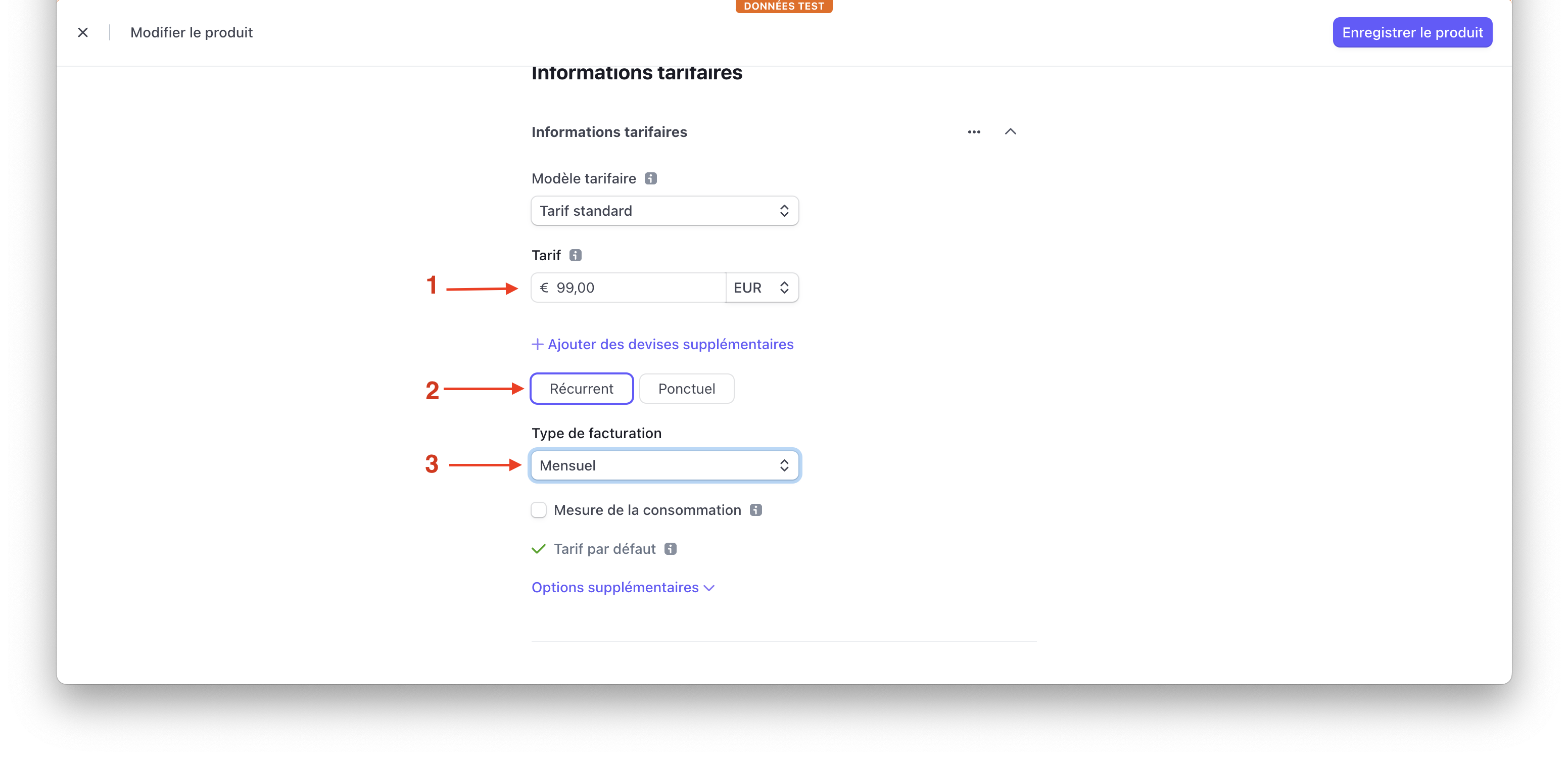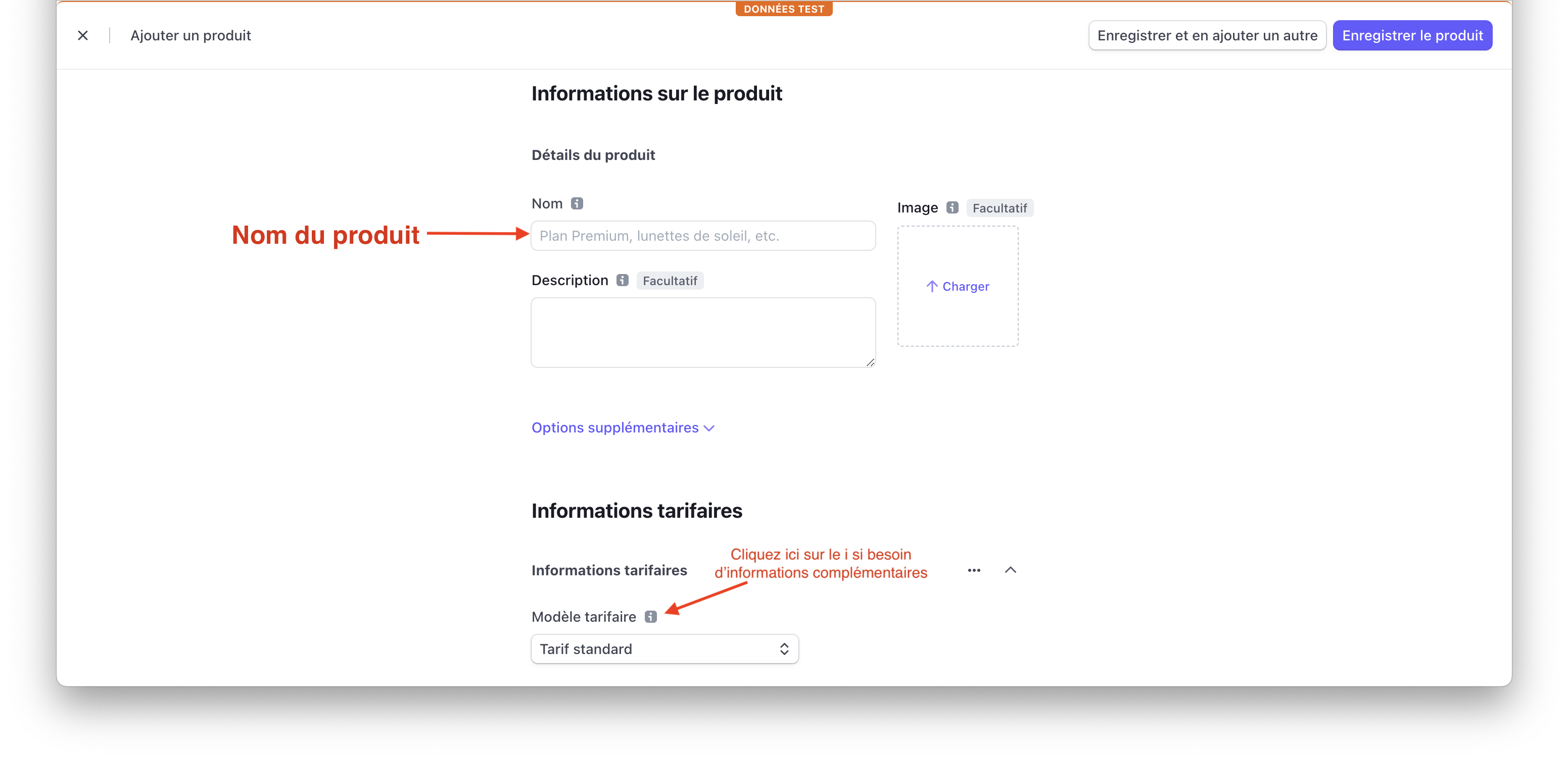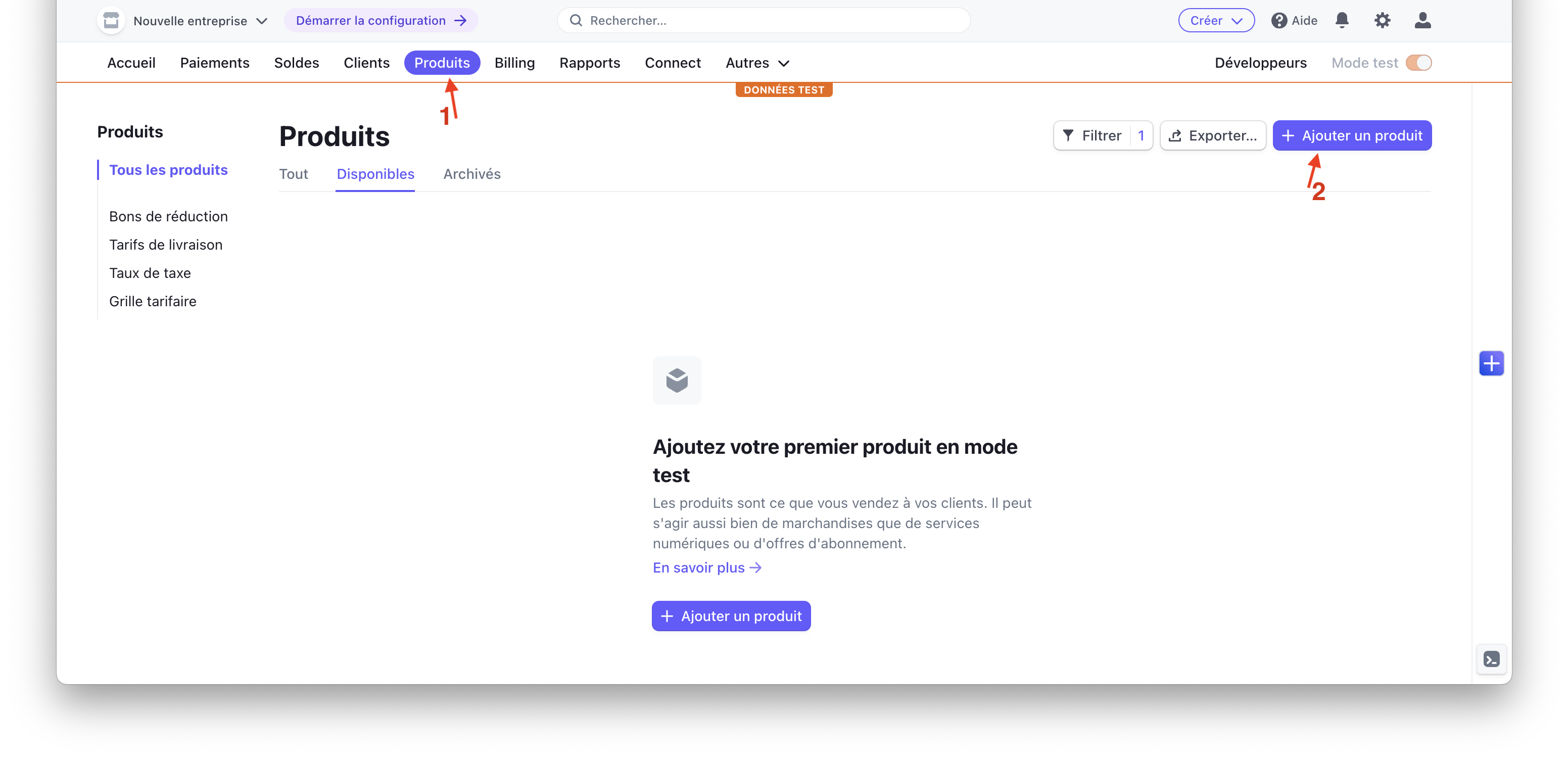 Depuis Stripe, vous devrez créer un produit depuis l'onglet billing puis cliquez sur créer un nouveau produit.