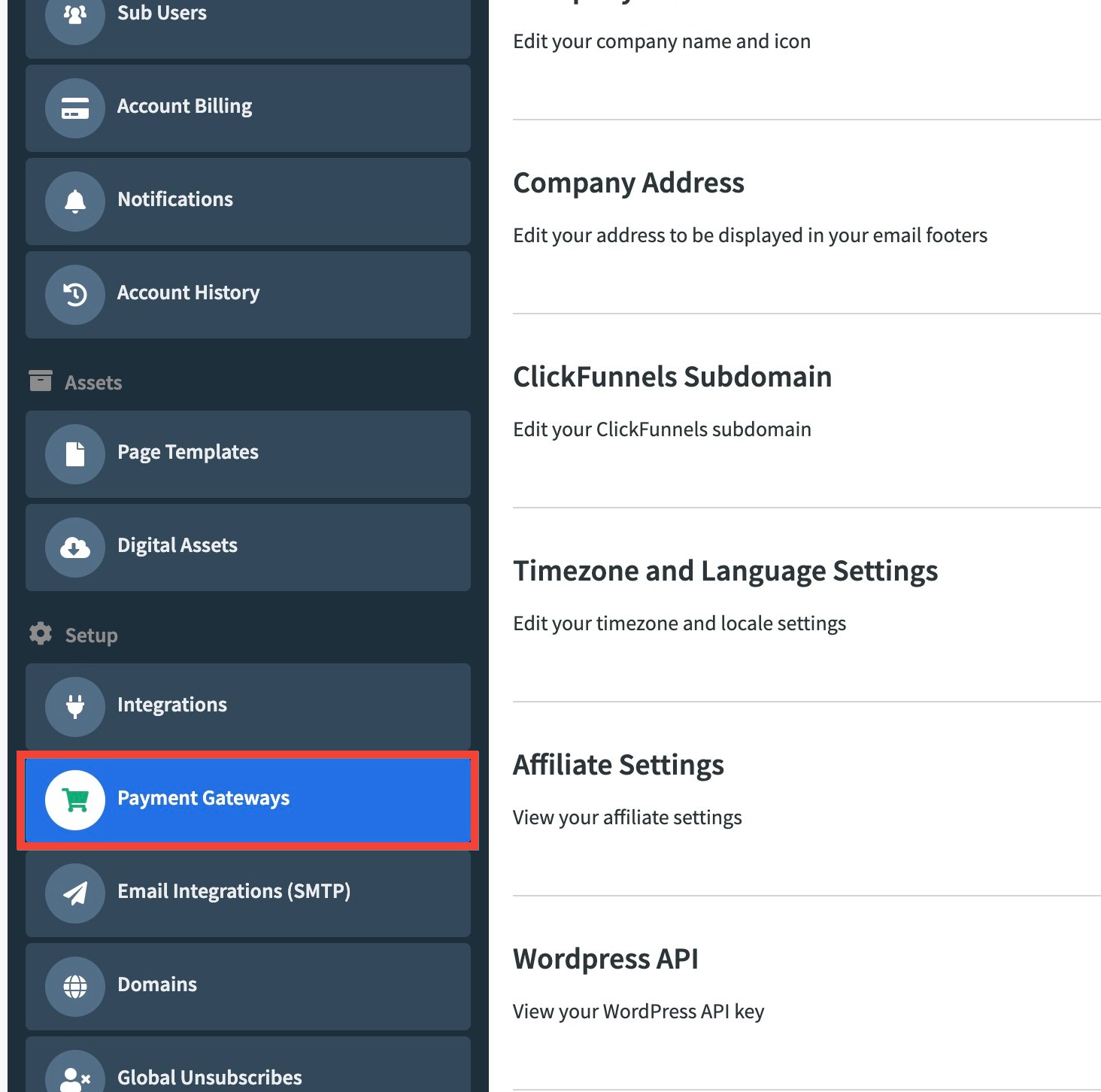 Ouvrez également votre compte ClickFunnels dans un nouvel onglet et allez dans les paramètres de votre compte.